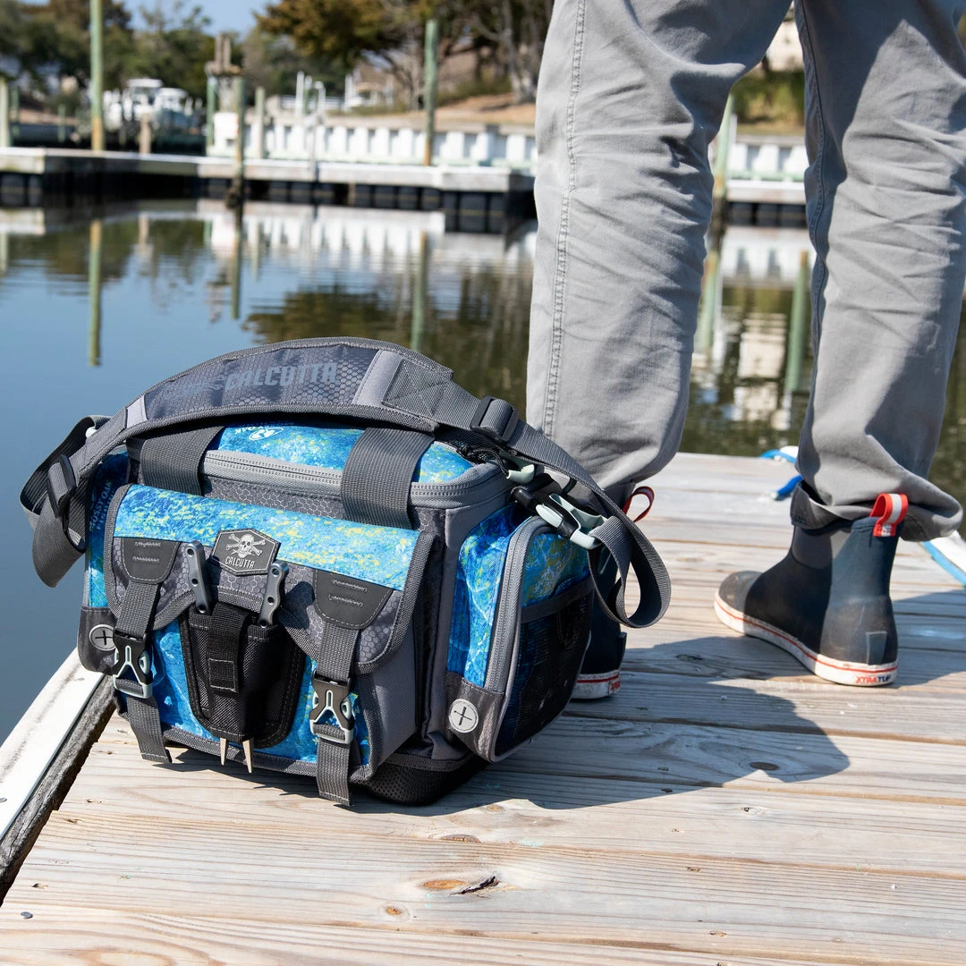 Organize your tackle efficiently and securely with the Squall Tackle Bags. Main storage compartment includes four tackle trays. External pockets with mesh compartments provide additional storage. Compression molded bottom prevents slipping, resists wear and adds stability. Exterior molded pliers holster for easy tool access. Padded adjustable shoulder strap for hands-free transport. Built-in rain cover completely covers pack if the going gets wet.
