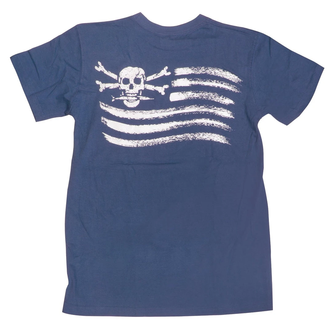 China Blue Ringspun Enzyme Washed T-shirt with Original Logo Flag design on back. Pocket front on all sizes except small.