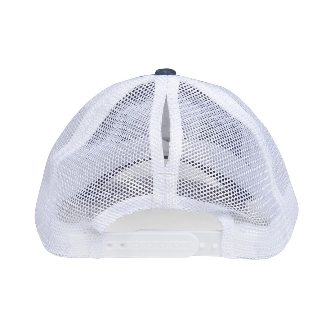 Ladies six panel mesh back hat with cut out for ponytails and messy buns. Adjustable plastic closure.