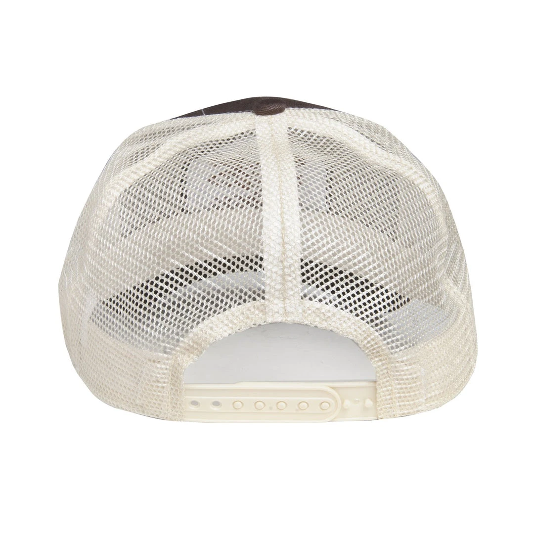 Six panel mesh back hat with snook pattern patch and embroidered logo. Adjustable plastic closure.