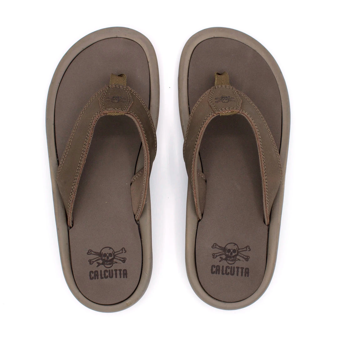 The Calcutta Squall flip flops features a non-marking outsole with a custom tread design featuring the iconic Calcutta skull and crossbones. The design of the custom sole helps channel water to the outside for superior traction on slippery surfaces. The Squall has a molded EVA midsole and a drop-in super soft footbed with raised arch. The uppers are made from action leather with a quick dry jersey lining and a Calcutta logo on the toe yoke. Available in whole sizes 8-13 and driftwood color.