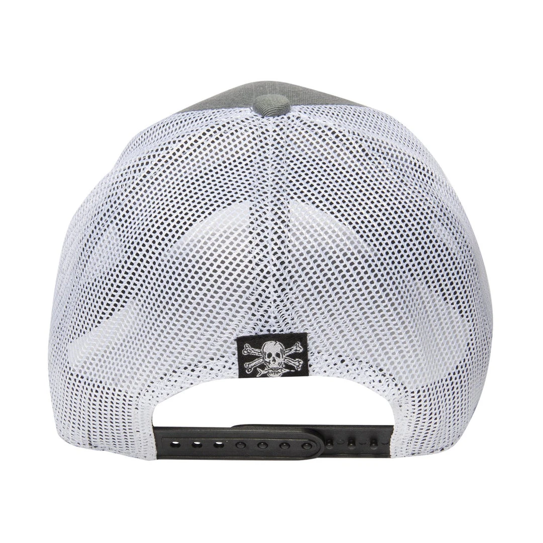 Six panel mesh cap with heather gray crown and brim, black under brim and white mesh. Sublimated felt patch artwork with embroidered classic logo up front and adjustable snap back closure.