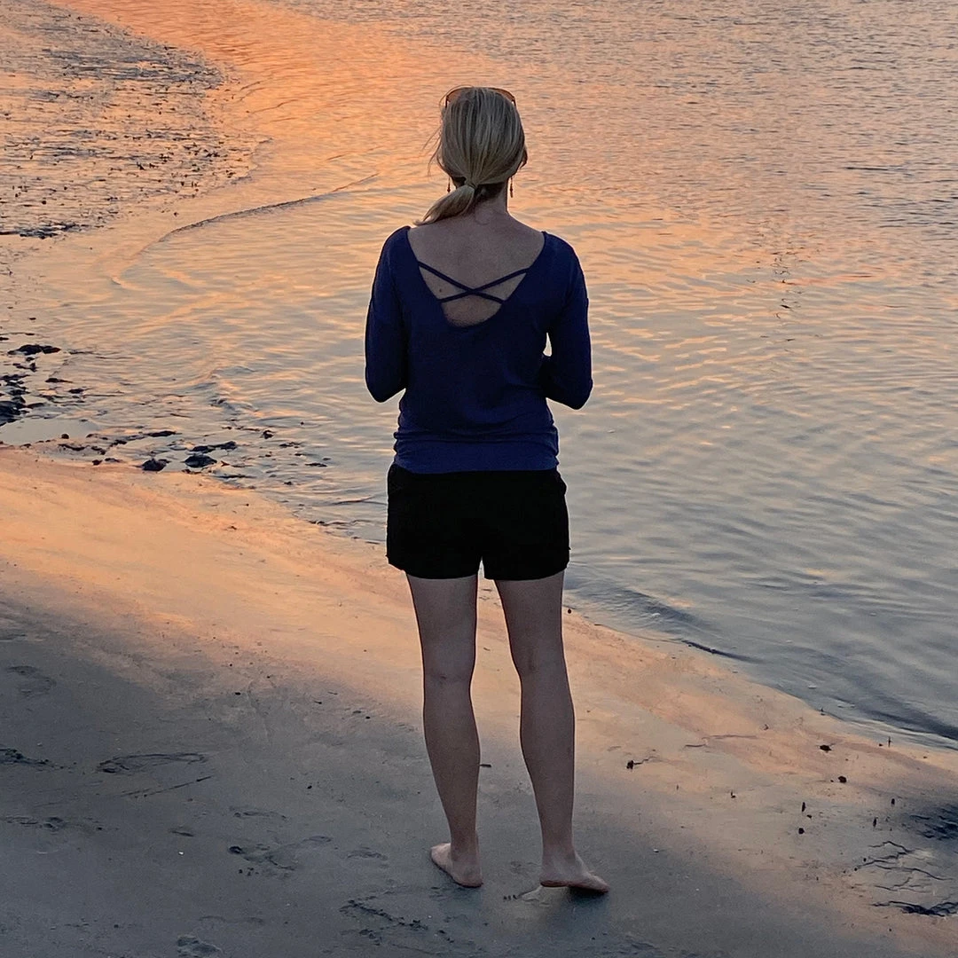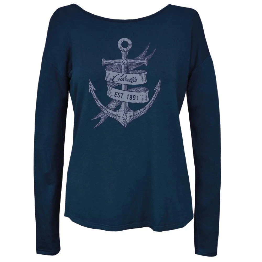 This women’s long sleeve tee features a drop shoulder, cross back straps, and rounded bottom hemline. Comfortable french terry blend fabric of rayon, polyester and spandex. Tone on tone graphic shows you are anchored in style.