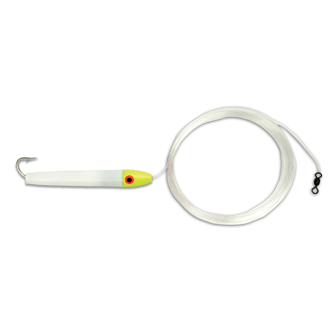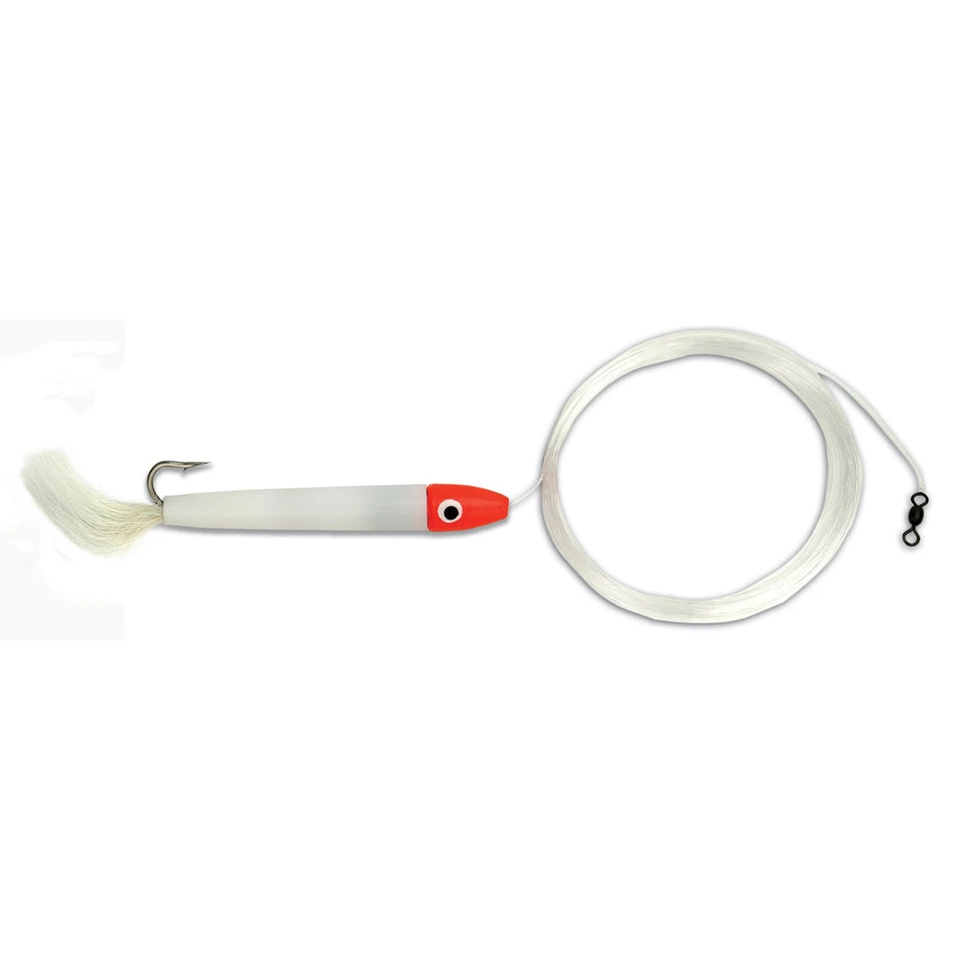 Great for blues and spanish mackerel. A miniature version of the popular cedar plug. Rigged with 18′ of 30 lb. mono and a 2/0 stainless steel hook. Available with plain or bucktail hooks.