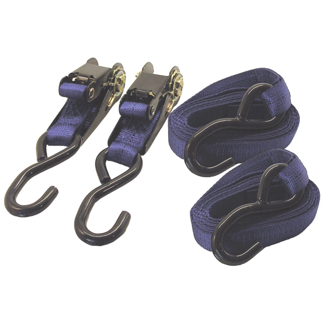 Fully adjustable with 2 coated J-hooks. High impact polyester webbing. Sold as pairs. 1″ x 6′ ratchet tie down straps.