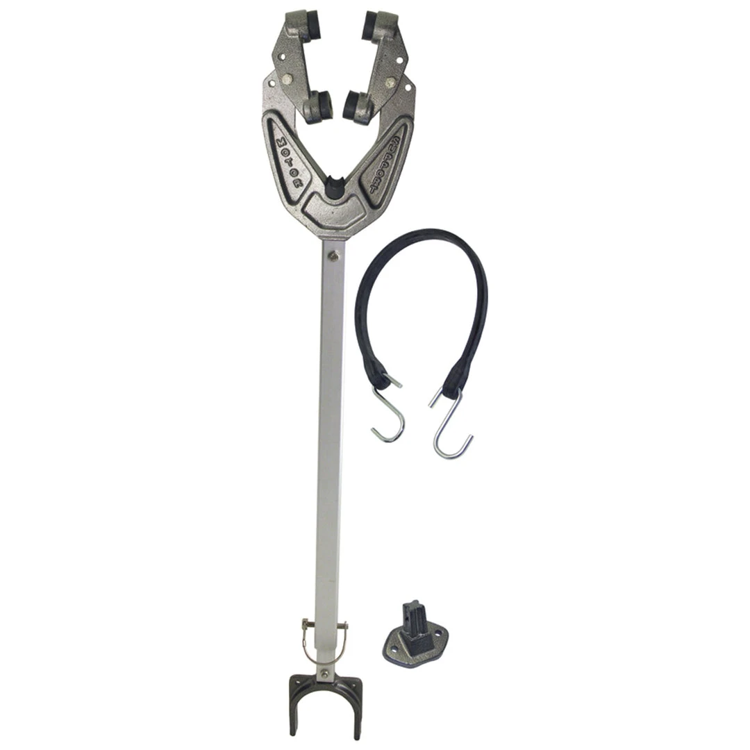 Protect your steering system, motor, and transom from road shock. Main shaft adjusts 36″ to 46″ long – mounts over trailer rollers or to trailer frame – both mounts included.