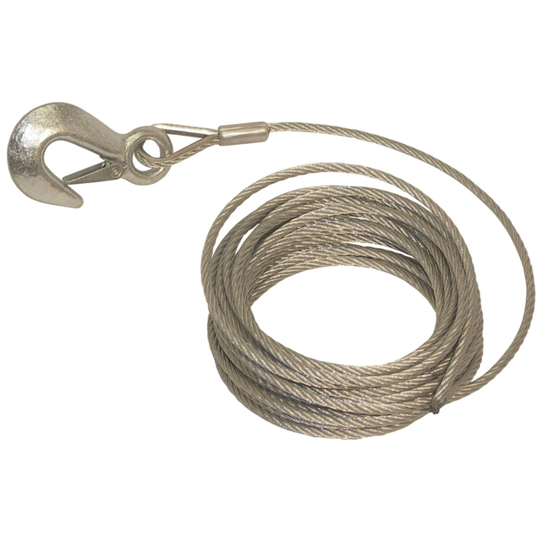 Constructed from galvanized aircraft cable and heavy duty galvanized snap hook. Cable tension strength is 4000 pounds. Works on all standard trailer winches.