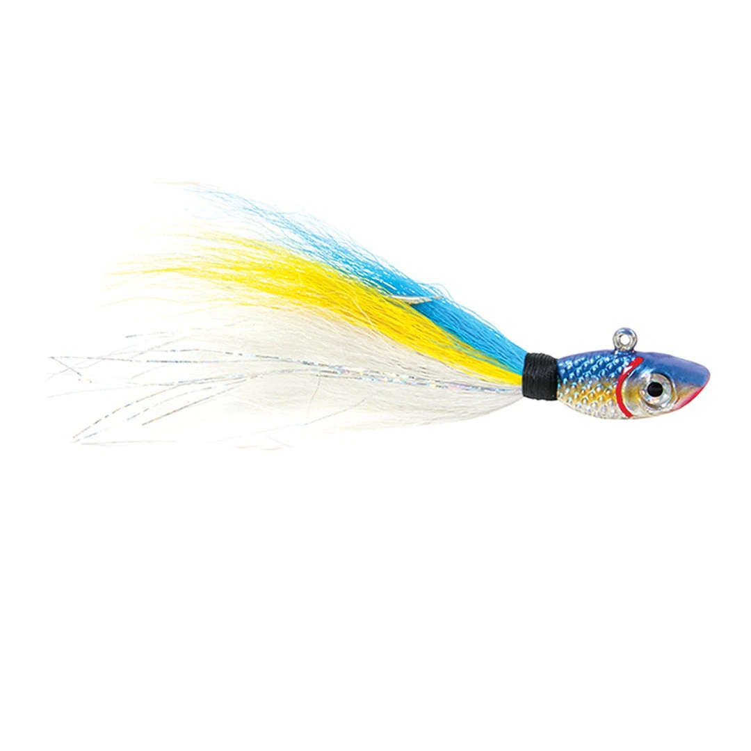 These jigs are meant to be seen and heard. An internal 7 mm pyrex rattle brings fish to the lure. Hand-tied, multi-colored, premium bucktail with glo trailer and epoxy coated thread is another attractant. Custom head shape features gill plates and recessed eye sockets. Scaled, holographic, multi-color paint with 3D eyes and a UV clear coat finish provide a realistic look. Made with Mustad 32786 black nickel hook.