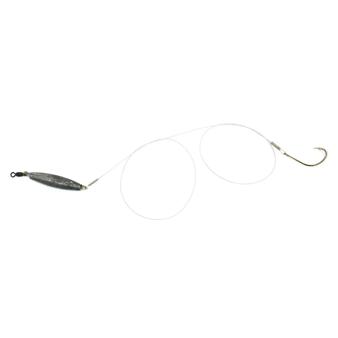 The “F3″ series is a popular flounder (fluke) rig that works great in all coastal areas where flounder are found. This rig has a 1 ounce swiveled cigar sinker attached to 22” of 40 lb. mono and a style 42, size 2, Sea Striker flounder hook. Available with a plain hook or dressed with bucktail.