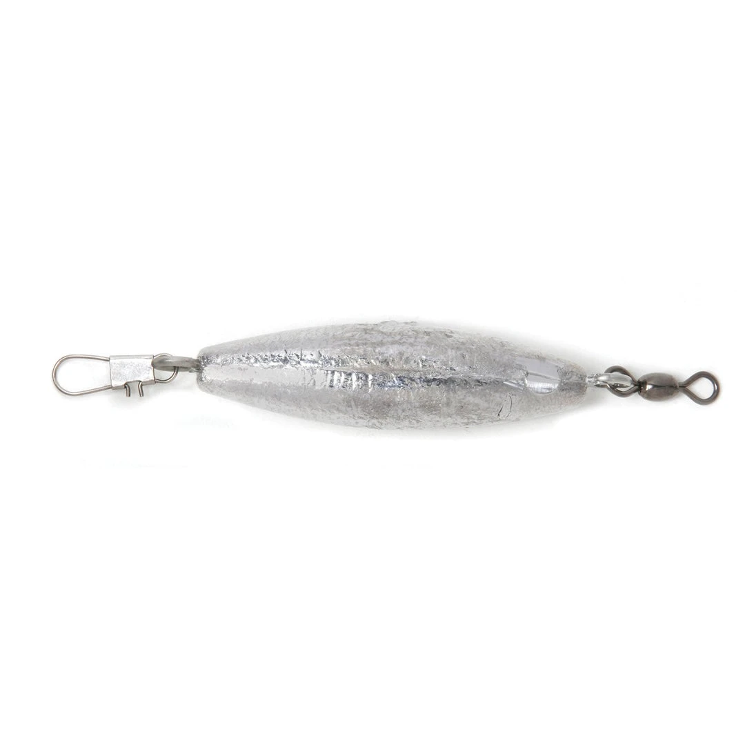 Lead trolling sinkers have a brass eye molded in each end. The ‘470’ series has a #7 crane barrel swivel on one end and a #3 interlock snap on the other.