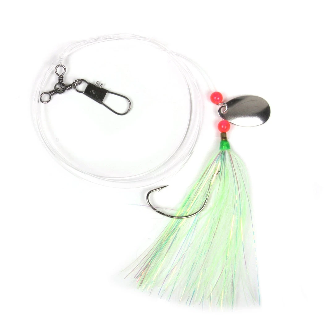 Another Eastern Shore and Northeast favorite for flounder (fluke). This 32″, 40 lb. leader has a #4, 3-way swivel at the top with a snap for sinker attachment. The bottom of the rig has a spinner blade, a bucktail teaser, and a 1/0 nickel plated, wide gap Flounder hook.