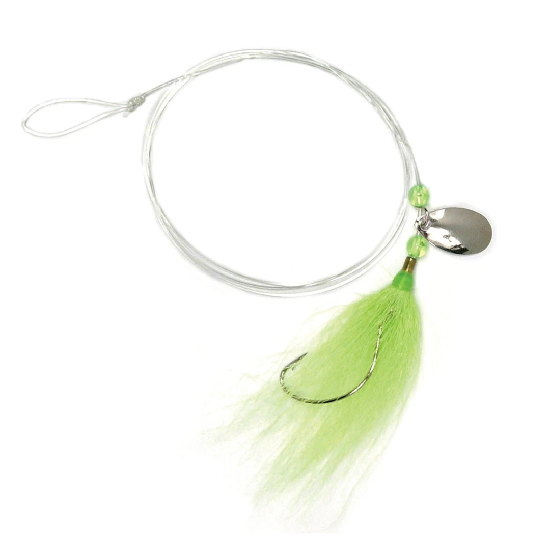 Another Eastern Shore and Northeast favorite for flounder (fluke). This 32″, 40 lb. Ieader has a loop at the top for rig attachment. It has a style 42, size 1/0 nickel plated wide gap hook. The hook is dressed with a spinner blade and a bucktail teaser tag.