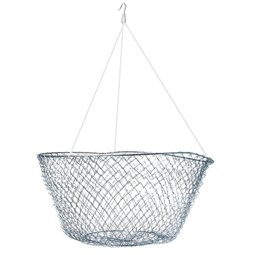 Two ring net with wire mesh netting. Corrosion-resistant aluminum rings. 18″ top ring diameter, 7.5″ bottom ring diameter