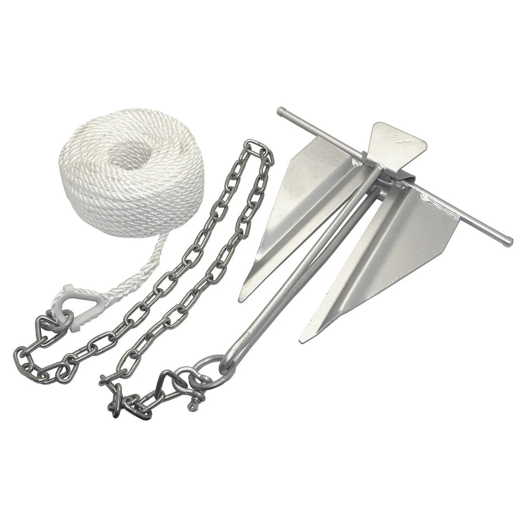 Slip ring anchor kit includes a #7 galvanized slip ring anchor, two 5/16″ drop forged shackles, a 3/8″ x 50′ twisted nylon rope with thimble and a 1/4″ x 4′ galvanized anchor chain.