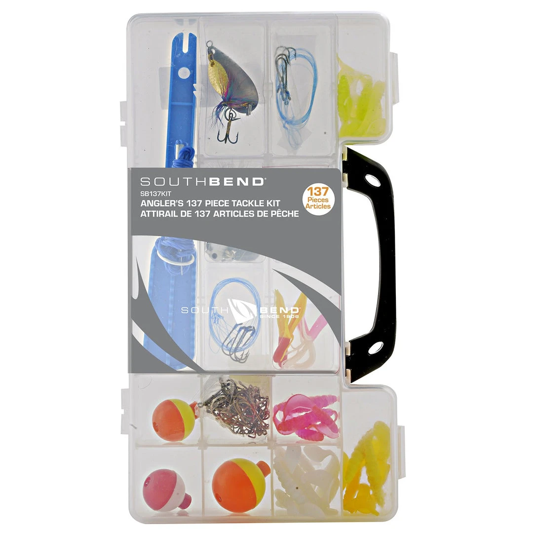 Includes: floats, assorted hooks & snells, swivels, grubs, shad, tubes, jigheads, spoon, spinner, marabou jig, steel sinkers, tin split shot, poly stringer, scaler and reusable tackle box